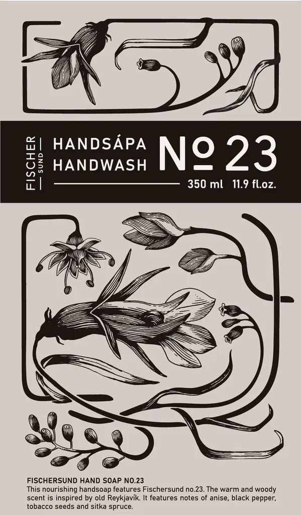 Fischersund No. 23 Handtvål förvandlar den enkla rutinen till ett doftminne. Här möter den ikoniska parfymens karaktär gamla Reykjaviks råa charm i en mild men lyxigt löddrande formula. Anis, svartpeppar, tobaksfrön och sitkagran skapar en djupt stämningsfull doft som känns som en frisk vind från hamnen, full av historia och närvaro.